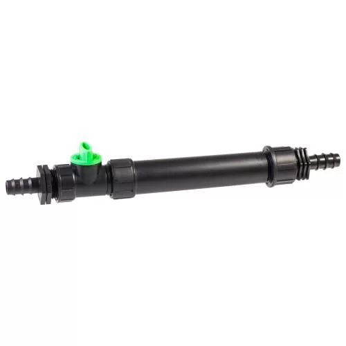 Призначений для встановлення фільтраційного елемента в систему крапельного поливу, де в якості магістральної труби використовується трубка сліпа діаметром 16 мм (відмінно підійде для крапельного набору "Фермер-1", Фермер-2" та "Квітник"). Цей вузол є регульованим, оскільки в ньому встановлений кран кульовий.