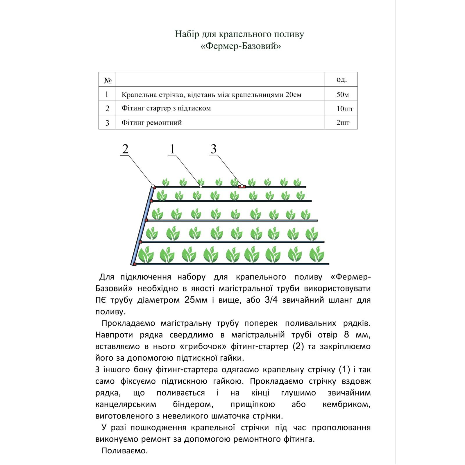 Набір для крапельного поливу "Фермер Базовий" в першу чергу призначений для людей, які вирішили перейти зі звичайного поливу на крапельний або вже користувалися крапельним поливом, але мають невелику ділянку, що поливається. Ціна набору є символічною, але при цьому набір розрахований для поливу 50 метрів грядок.