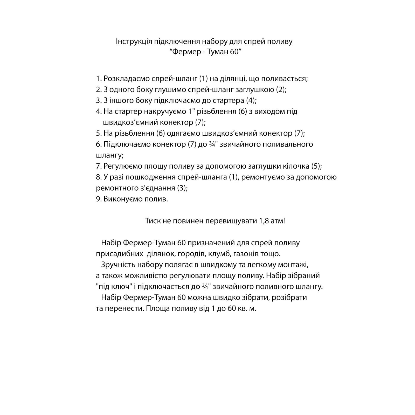 Набір для спрей поливу "Фермер - Туман 60" призначений для спрей поливу присадибних ділянок, городів, клумб, газонів тощо. Зручність набору полягає у швидкому та легкому монтажі, а також у можливості регулювати площу поливу. Набір зібраний "під ключ" і підключається до 3/4" звичайного шланга для поливу. Набір "Фермер-Туман 60" можна швидко зібрати, розібрати і перенести. Площа поливу від 1 до 60 кв.м.