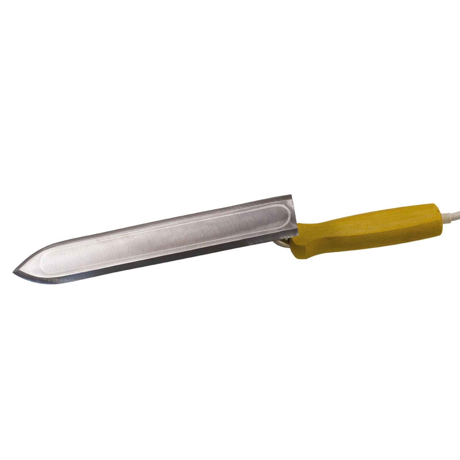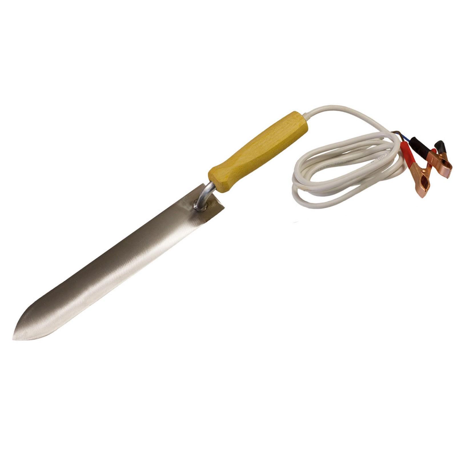 Предназначен для обрезки забруса с пчелиных сот. Очень прост и удобен в использовании, значительно повышает продуктивность работы пчеловода. Работа ножа предусматривает кратковременные цыклы, во время которых нож охлаждается в процессе срезания забруса и нагревается, пока пасечник готовит следующую рамку. Производится двух видов: из нержавеющей и черной стали.