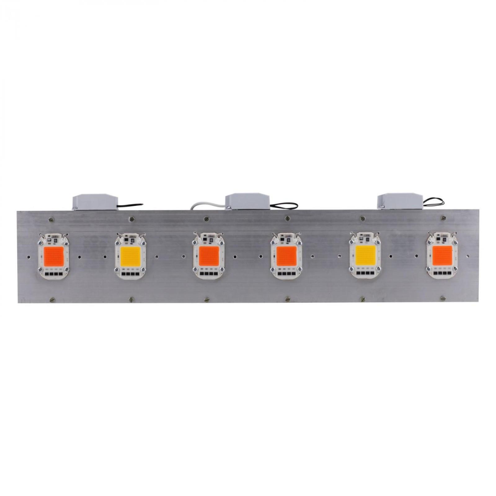 Основа светильника – две матрицы белого света и четыре фитоматрицы мощностью по 50 ватт, с двумя пиками излучения – в области синего и красного света. Соотношение 1:3 (синий, красный), есть, также немного жёлтого, ультрафиолетовый, дальний красный и инфракрасный. Использование тёплого белого света, даёт дополнительные спектральные составляющие, благодаря которым свет, по своим характеристикам, приближается к солнечному свету. Общая цветовая комбинация создаёт универсальный спектр хорошо подходящий для использования на всех фазах роста и развития растений - от побегообразования до цветения и образования плодов. Фитосветильник рекомендуется использовать для освещения молодых растений во время набора зеленой массы, идеально подходит для выращивания рассады, стимуляции развития молодых побегов, для гидропоники и гроубоксов, а также досвечивания домашних растений при нехватке света (например, в осенне-зимний период, когда день становится короче).