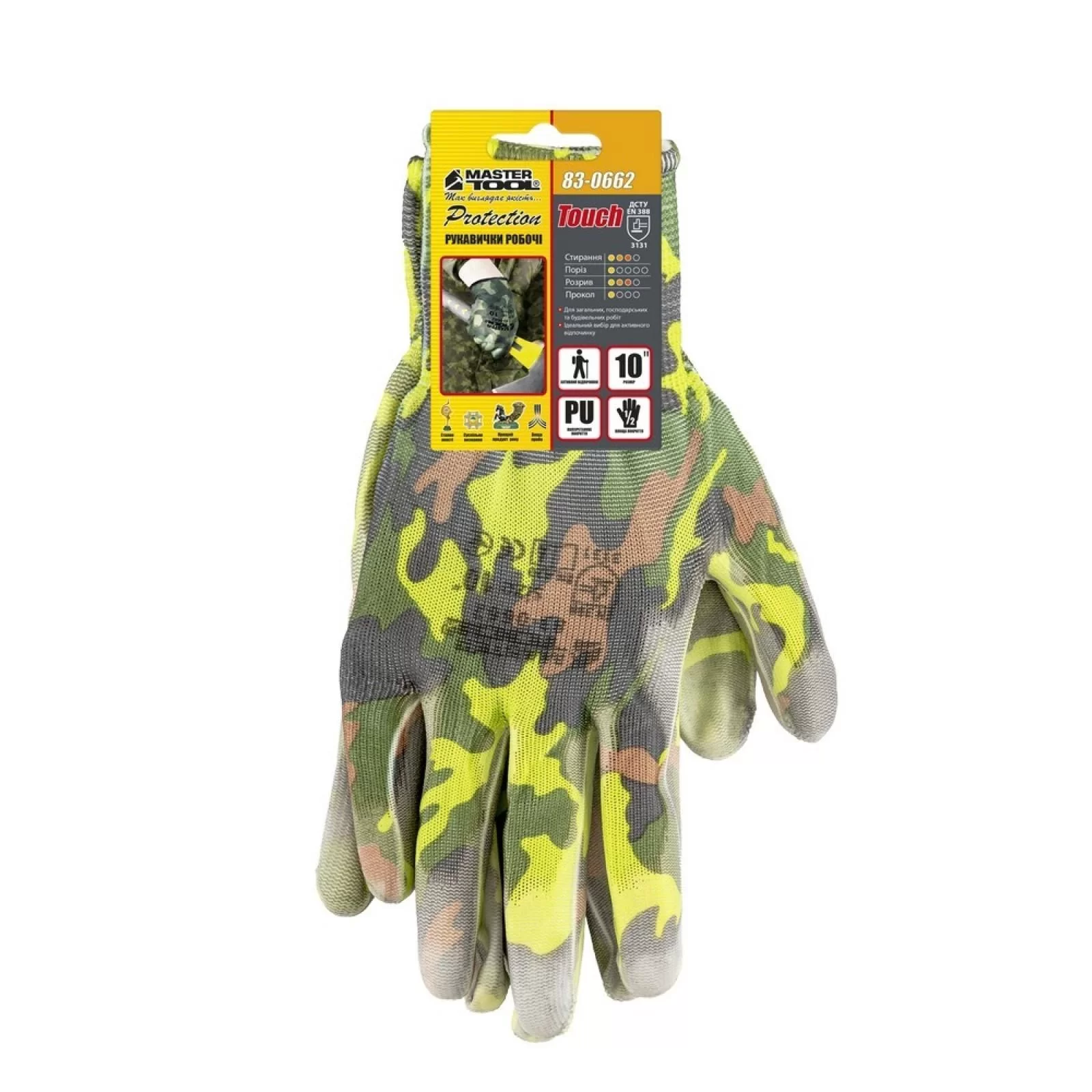 Перчатки бесшовные трикотажные MASTERTOOL "Камуфляж" с полиуретановым покрытием ладони 10" 17-20 г подвес